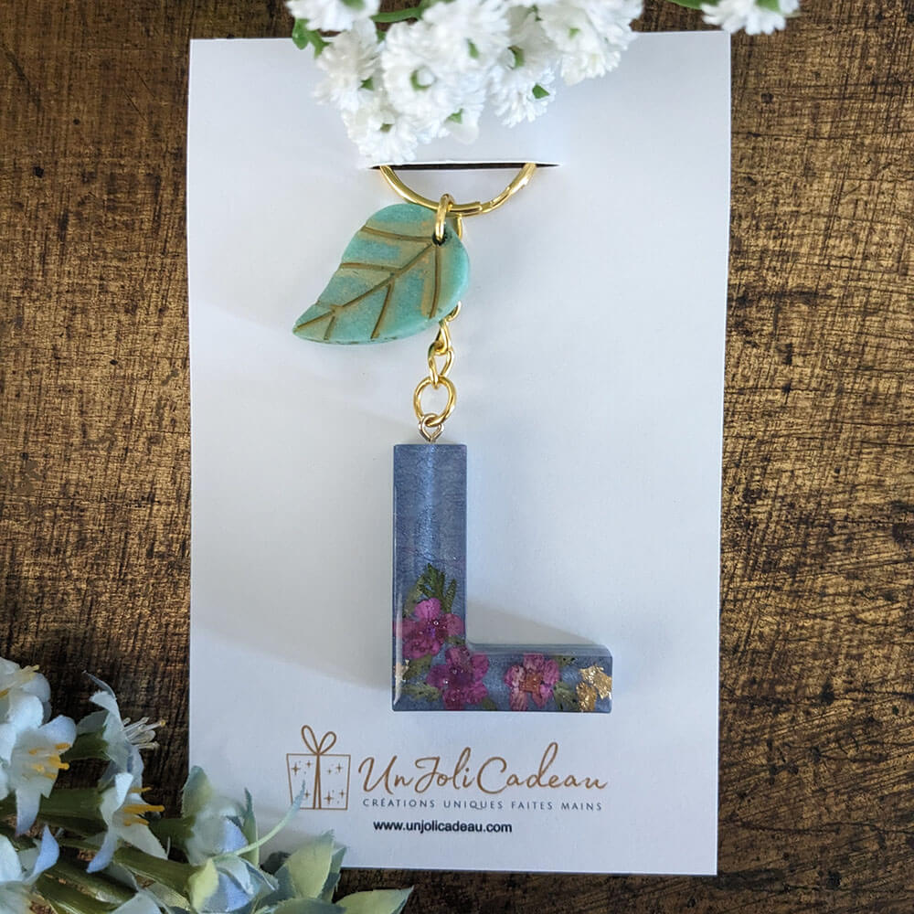 Ce ravissant porte-clés en forme de lettre L est une ode à la nature. Son fond gris satiné met en valeur de délicieuses fleurs naturelles violettes, créant un contraste saisissant et élégant. Entièrement réalisé à la main en résine époxy, il est à la fois unique et durable. Offrez-le à un être cher aimant la nature et l’originalité.